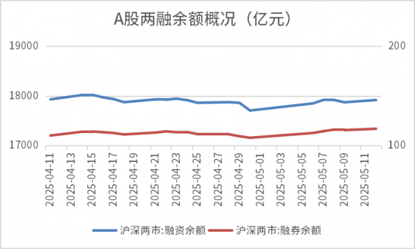 截至05月12日,两市融资余额为17917.71亿元,较前一交易日变动幅度为0.25%;融券余额为116.92亿元,较之前变动幅度为1.10%。