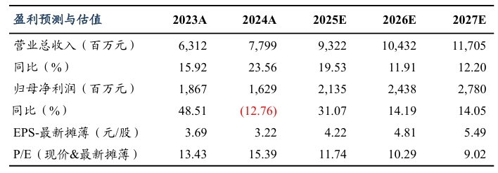 我们维持公司2025-2027年归母净利润预测21 (同比+31%)/24(同比+14%)/28(同比+14%)亿元,当前市值对应PE分别为12/10/9X,维持“买入”评级。