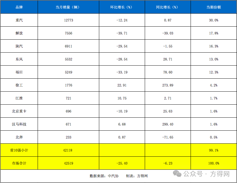 从整体市场来看,4月份前十强企业合计份额超99%,市场集中度极高。前10强企业牵引车合计销量达到4.2万辆,市场份额合计99.1%,留给前10强以外企业的市场份额不到1%;前5强市场份额合计89.4%,留给其他企业市场份额仅10.6%。这样的市场集中度不仅体现头部企业的优势地位,也反映出当前牵引车市场白热化的竞争态势。