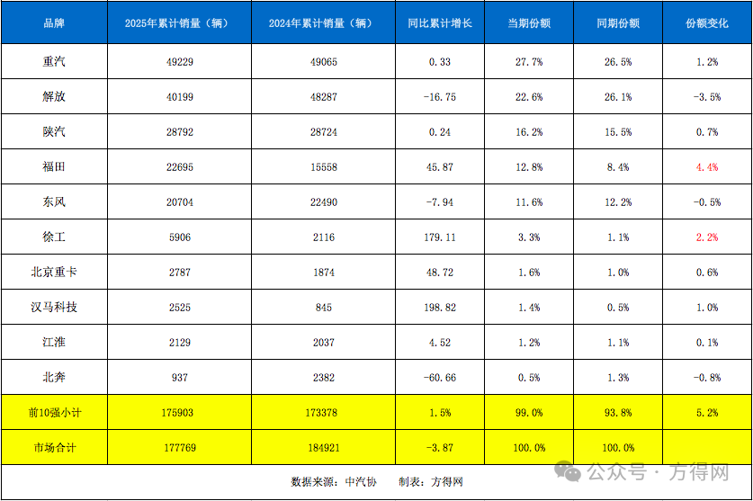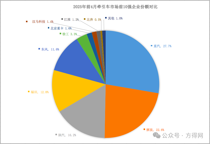 解放紧随其后,前4月累计销量同样破4万辆,与重汽形成双寡头的竞争格局。数据显示,1-4月,解放累计销售牵引车为4万辆,市场份额达到22.6%,位居行业第二。值得留意的是,前4月,重汽与解放两者份额之和高达50.3%,以两家之力占据一半市场,头部企业展现出强大的竞争态势。