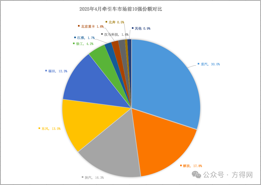 值得注意的是,4月,重汽、解放、陕汽,三家头部企业的牵引车市场份额之和达到64.1%,以三家之力占据牵引市场近2/3的份额。这一现象凸显出行业竞争门槛的持续提升,资金、技术、渠道的多重壁垒加速行业洗牌,强者愈强的马太效应越发明显。