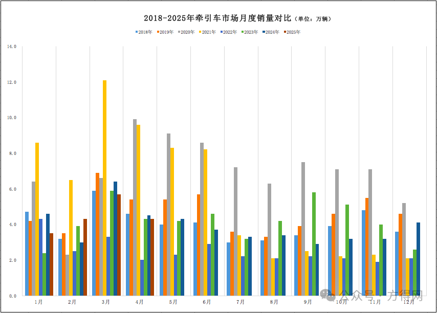 从历史维度审视,当前市场表现较为不乐观。中汽协数据显示,2018-2025年间,4月牵引车销量基本在4.5万辆以上,其中2020、2021两年同期销量更以超9万辆创新高。而今年4月的4.3万辆销量成绩,低于近八年平均销量,仅高于2022大降之年的销量,是近八年来同期的“次低”。
