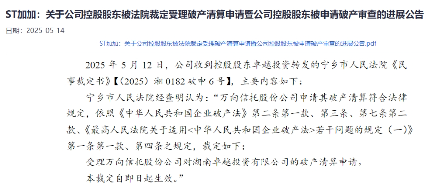 5月14日晚间,ST加加发布公告称,公司于12日收到控股股东湖南卓越投资有限公司(简称“卓越投资”)转发的宁乡市人民法院《民事裁定书》。该法院裁定受理万向信托对卓越投资的破产清算申请,裁定自即日起生效。