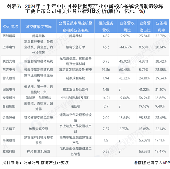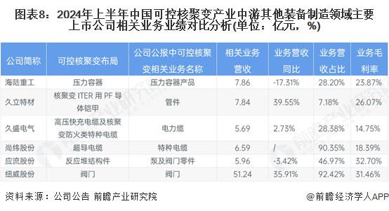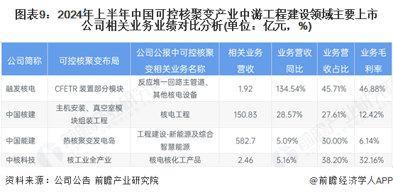 2024年上半年,中国可控核聚变产业中游工程建设领域主要上市公司中,中国核建和中国能建的相关业务规模较大,都在百亿元级别;融发核电的反应堆一回路主管道、其他核电设备业务营收同比增长134.54%,且毛利率高达46.88%,成长性强。