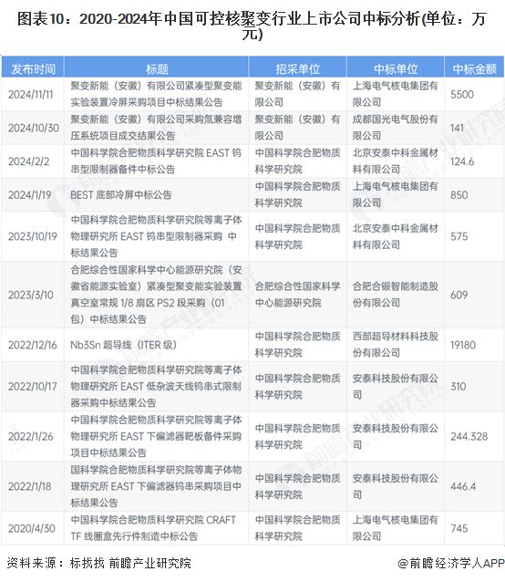 从具体的核聚变业务招投标上看,根据标找找查询数据,2020年至2024年底,国内上市公司中标实践汇总如下,可以看出,上海电气、安泰科技和西部超导是国内可控核聚变领域上市公司中重要的中标主体。