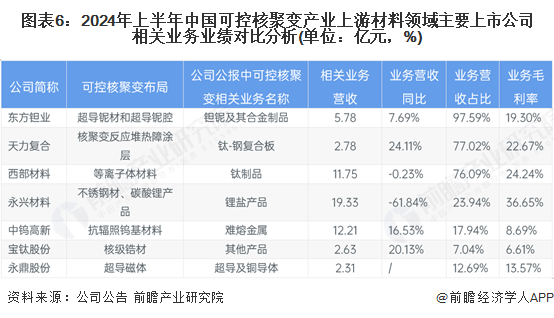 细分可控核聚变产业领域。2024年上半年,东方钽业钽铌及其合金制品业务营收5.78亿元,同比增长7.69%,该项业务营收占比97.57%,是为可控核聚变提供超导铌材的专业供应商;中钨高新的难熔金属业务规模较大,营收增速相对较快;永鼎股份的超导及铜导体业务在2024年上半年营收2.31亿元,业务毛利率水平一般。