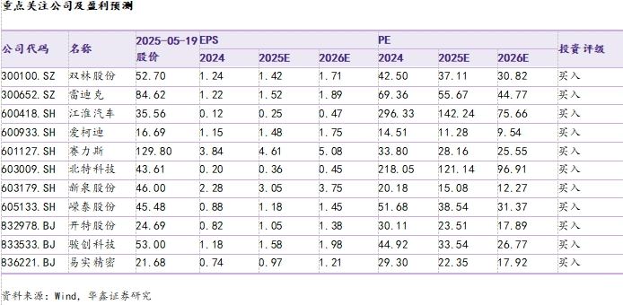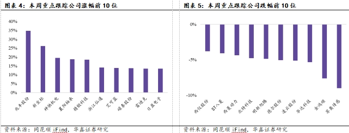 在我们重点跟踪的公司中,兆丰股份(34.8%)、新坐标(26.2%)、神驰机电(19.6%)等涨幅居前,苏奥传感(-9.0%)、金鸿顺(-7.6%)、华达科技(-5.3%)等位居跌幅榜前列。