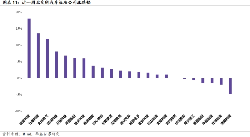 本周我们跟踪的23家北交所汽车板块公司涨跌幅均值为3.4%,中位数为2.0%。建邦科技(18.0%)、九菱科技(13.5%)、大地电气(11.9%)等表现居前,浩淼科技(-4.9%)、开特股份(-2.0%)、华原股份(-1.5%)等表现靠后。