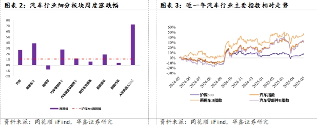 其中,乘用车涨3.9%, 商用车跌0.7%,汽车零部件涨2.8%,汽车销售及服务涨1.2%,摩托车及其他涨0.6%。概念板块中,新能源车指数涨1.9%,智能汽车指数涨0.4%,人形机器人指数涨7.3%。近一年以来(截至2025年5月16日),沪深300涨7.3%,汽车、新能源车、智能汽车涨跌幅分别为32.8%、11.7%、24.6%,相对大盘的收益率分别为+25.5pct、+4.4pct、+17.3pct。