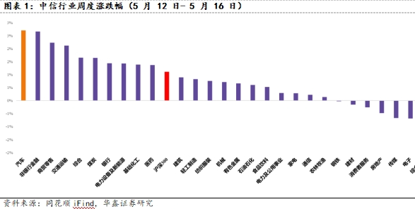 本周钢铁、铜、铝、橡胶价格均有下降。本周(5 月 12日- 5月16 日),我们重点跟踪的钢铁、铜、铝、橡胶、塑料均价分别为 0.37/7.87/2.02/1.20/0.72 万元/吨,本周周度环比分别为 +2.4%/+0.3%/+2.6%/+4.5%/+0.4%。5月 1 日- 5月16日价的月度环比分别为-7.0%/+3.0%/-0.1%/-6.4%/-0.8%。