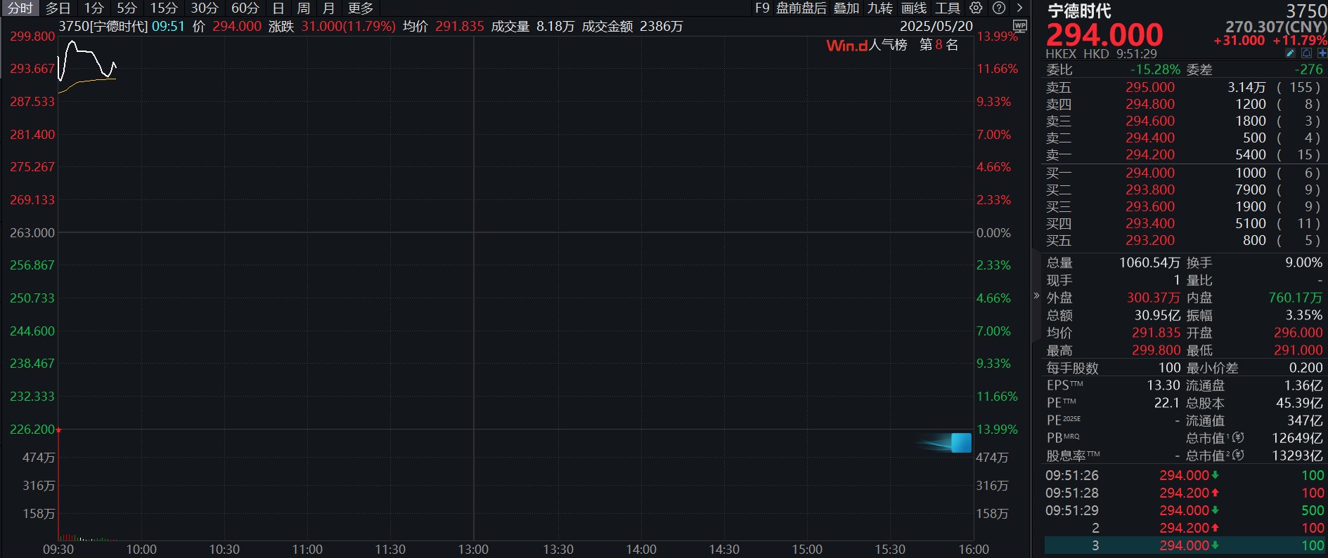 5月20日,宁德时代正式在港交所上市交易,上市首日高开12.55%,报296港元/股。截至发稿,涨11.79%,报294港元/股。