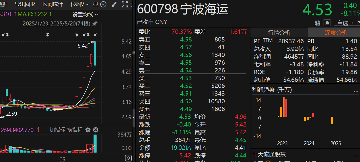 值得一提的是,某些高位抱团股在今日显示出了退潮迹象。军工板块中,利君股份跌停;航运板块中前期大热的宁波远洋跌停,宁波海运跌超8%。