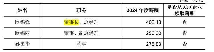 而欧锦锋担任悍高集团董事长、总经理,欧锦丽担任公司董事、副总经理。招股书显示,2024年,欧锦锋薪酬为408.18万元、欧锦丽薪酬为256万元,二人合计薪酬为664.18万元。