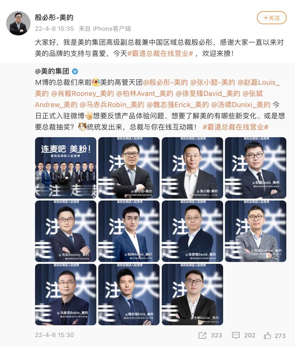 记者注意到,2022年4月,美的集团曾经在微博上发起“连麦吧 美粉”的活动,美的总裁团集体入驻微博。彼时,殷必彤以美的集团高级副总裁兼中国区总裁的身份,站在“C位”。不过,殷必彤仅发布了这一条微博,在评论区也并没有与“美粉”进行互动。