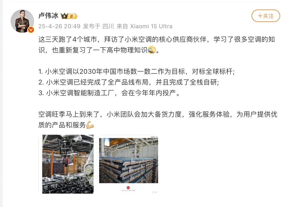 5月17日,小米集团总裁卢伟冰在直播中谈到空调业务时,称“目前希望今年能不能从第四名到第三名,到2030年能不能在中国市场做到数一数二。”