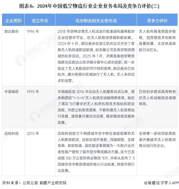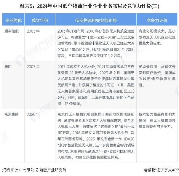 低空物流行业竞争格局主要包括两部分,其中主流快递公司或电商企业提供个性化的物流解决方案,无人机、通用航空等设备公司提供技术和设备支持。具体来看,京东、顺丰、美团等物流和电商企业凭借技术和资金优势,积极布局无人机配送业务,探索常态化、商业化运营新场景,不断提升低空物流的效率和安全性,成为低空物流领域的重要参与者。而大疆、迅蚁科技等无人机制造商,以及一些通用航空企业则在无人机设计与制造领域占据领先地位,为低空物流提供了关键技术支持。这些企业通过技术创新和运营模式优化,不断提升低空物流的效率和安全性,共同推动低空物流行业的发展。