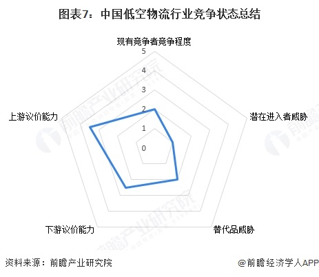 运用波特的“五力”模型,对中国低空物流行业的竞争环境进行分析,对各方面的竞争情况进行量化,5代表最大,0代表最小,具体五力竞争分析总结如下: