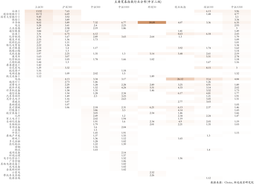 从申万二级行业权重的变动情况来看,变动较为明显的为股份制银行Ⅱ(最新:10.72%;变动:1.08%)、白酒Ⅱ(最新:13.92%;变动:0.88%)、工业金属(最新:4.47%;变动:0.69%),煤炭开采(最新:2.55%;变动:-0.33%)、证券Ⅱ(最新:3.31%;变动:-0.39%)、电力(最新:5.28%;变动:-0.40%)。