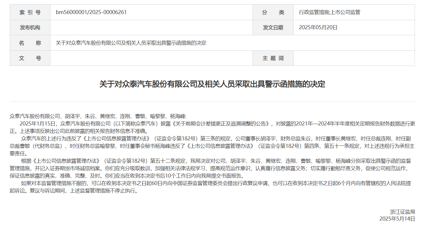 近日,浙江证监局发布关于对众泰汽车及公司董事长胡泽宇等7人采取出具警示函措施的决定。
