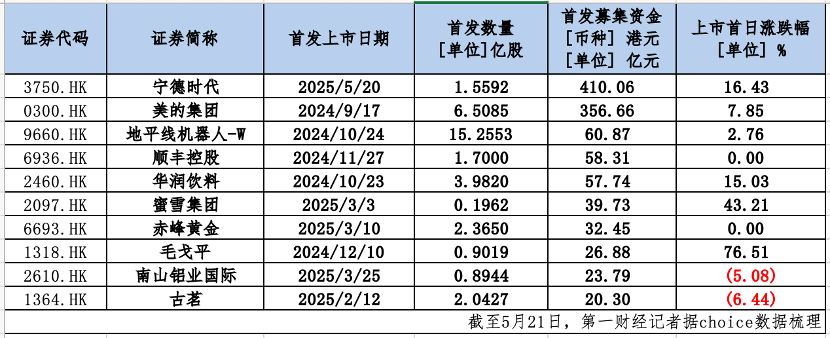其中,宁德时代、美的集团募资规模居前,首发募集资金分别为410亿港元、356.66亿港元,成为2024年以及2025年截至目前的“募资王”。地平线机器人-W(09660.HK)、顺丰控股(06936.HK)、华润饮料(02460.HK)位于第二梯队,首发募资额均在50亿港元以上,分别为60.87亿港元、58.31亿港元、57.74亿港元。