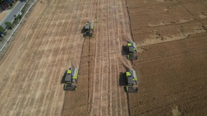 襄阳熟,湖北足。近日,湖北襄阳市南漳县迎来小麦大面积收获。5月19日,在当地惠平农机合作社的千亩麦田里,金色麦浪如汉江奔涌的碧波,数台中联重科履带式谷物联合收割机轰鸣向前,在麦浪间织就了一幅现代化农业图景。