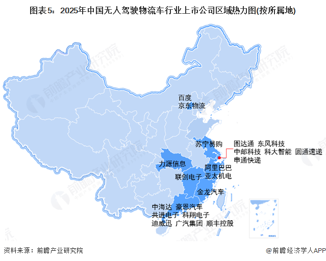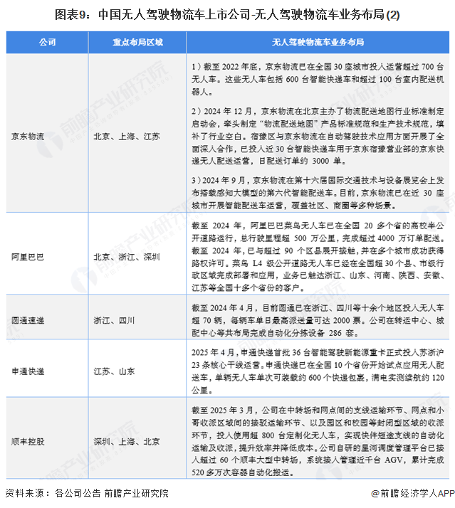 无人驾驶物流车行业的上市公司中,京东物流、阿里巴巴、顺丰控股、圆通速递和申通快递等物流企业的无人驾驶物流车业务布局最广,这些企业重点布局在北京、上海和深圳等一线地区。其余企业均处于无人驾驶物流车小范围投入使用阶段,其中广汽集团虽有强大物流车无人化技术,但目前尚未投入市场使用。