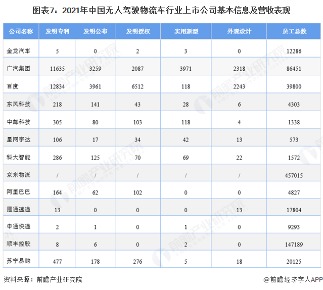 从无人驾驶物流车行业的上市企业已有的公开信息分析,专利信息相对较多的企业是广汽集团,其中发明专利11635条。员工总数最多的则是京东物流,员工总数为457015人。