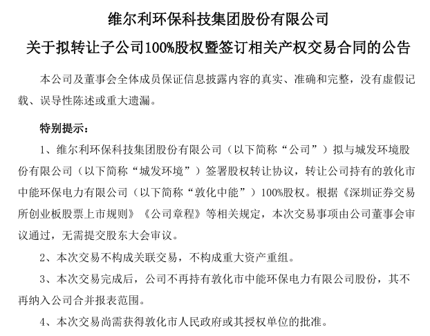 #北极星固废网获悉,5月19日维尔利发布公告,公司拟与城发环境股份有限公司签署股权转让协议,转让公司持有的敦化市中能环保电力有限公司100%股权。此次交易的股权转让价格为1亿元,交易对方还需承担截至标的股权交割日敦化中能应向公司偿还的全部股东借款,合计约为2.23亿元。本次交易对价由上述两部分构成,共计约3.23亿元。