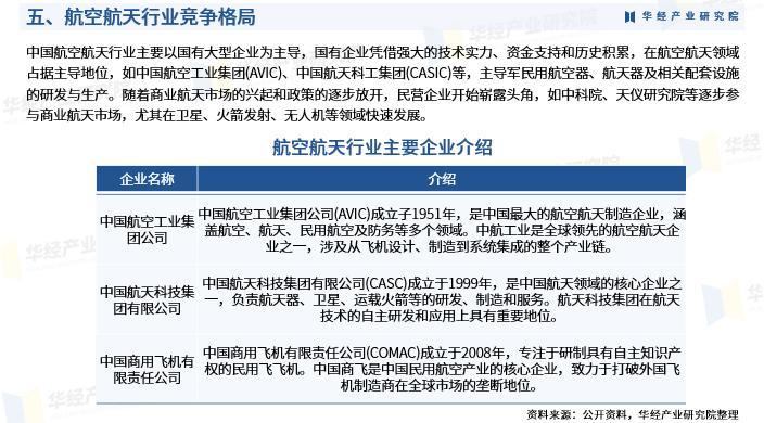 中国航空航天行业主要以国有大型企业为主导,国有企业凭借强大的技术实力、资金支持和历史积累,在航空航天领域占据主导地位,如中国航空工业集团(AVIC)、中国航天科工集团(CASIC)等,主导军民用航空器、航天器及相关配套设施的研发与生产。随着商业航天市场的兴起和政策的逐步放开,民营企业开始崭露头角,如中科院、天仪研究院等逐步参与商业航天市场,尤其在卫星、火箭发射、无人机等领域快速发展。