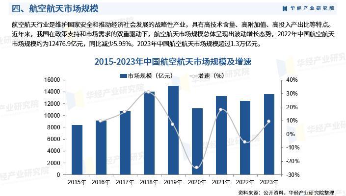 航空航天行业是维护国家安全和推动经济社会发展的战略性产业,具有高技术含量、高附加值、高投入产出比等特点。近年来,我国在政策支持和市场需求的双重驱动下,航空航天市场规模总体呈现出波动增长态势,2022年中国航空航天市场规模约为12476.9亿元,同比减少5.95%。2023年中国航空航天市场规模超过1.3万亿元。