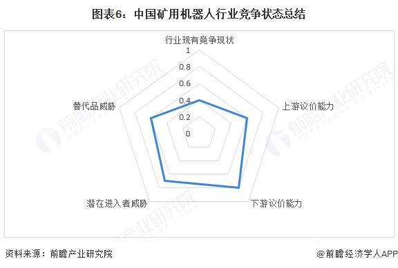 根据以上分析,对各方面的竞争情况进行量化,1代表最大,0代表最小,目前我国矿用机器人行业五力竞争总结如下: