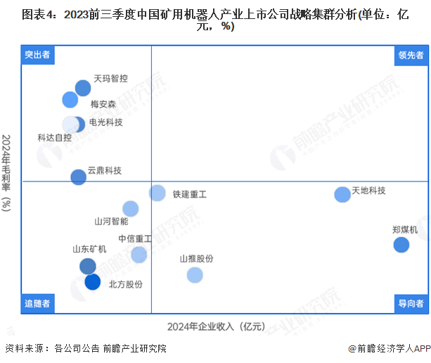 根据2024年营收年及毛利率进行矿用机器人行业集群的划分,目前行业内未有领先者,即同时在营收和增速同时双高的企业。目前大部分企业在矿业场景上主要的设备还是无人车、自动输送带、掘进机、挖煤机等,这些机械设备也是目前矿井中使用最高的设备,而矿用机器人是起到一个辅助作业,提高大型装备作业效率的作用。目前向导者较多,例如郑煤机、天地科技、铁建重工、山推股份等,营收处于领先地位,但近年毛利率乏力。此外这些企业的矿用机器人产品专注度较低,机器人业务在企业中占比低于5%。中信重工、山河智能等机械设备制造商近年来谋求智慧化转型,未来也朝着导向者方向发力。另外,突出者是毛利率超过30%的企业,例如天玛智控、梅安森、电光科技、科达自控等,这些企业利润留存处于行业领先地位。