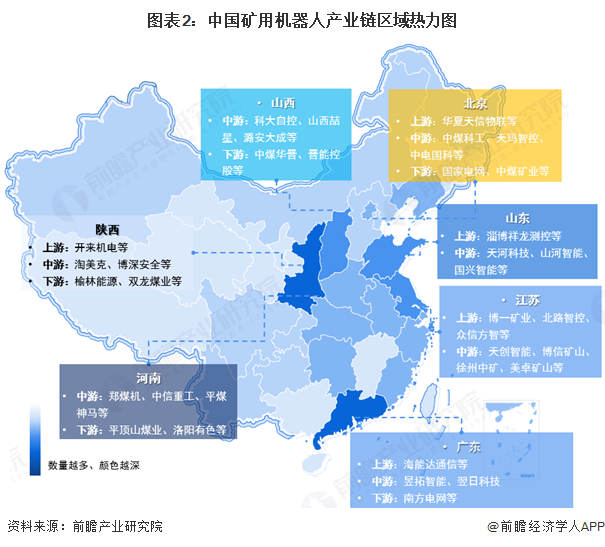 从矿用机器人产业链区域来看,产业链较完善的有广东、陕西、山东、江苏、山西五省。广东、江苏的产业链上游完善的零部件、机床、配套设备和通信系统企业聚集效应好,同时相关外资企业较多,因此中游吸引了一批矿用机器人制造商,为下游周边地区提供产品和服务。陕西、山东和山西三省主要是因为下游有较多的矿山,矿用机器人需求较大,聚集了一批矿用机器人企业。其他区域还有北京、湖南、辽宁、上海、安徽、福建等地,区域产业链较完善。