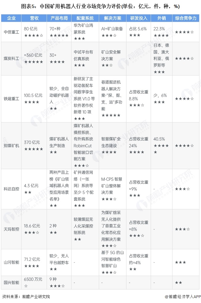为了量化矿用机器人行业的竞争态势,通过对十家重点矿用机器人企业建立评价指标模型,用六个维度对企业的矿用机器人市场收入、产品布局、配套系统、解决方案、研发投入以及外销情况进行综合分析,了解到中信重工、煤炭科工、铁建重工、郑煤矿机四家企业在六个指标维度上处于领先地位。这四家企业营收能力强,产品、配套系统和解决方案均有布局,研发投入强劲,还有部分外销收入,综合来看在矿山机器人行业中有较好的竞争优势。