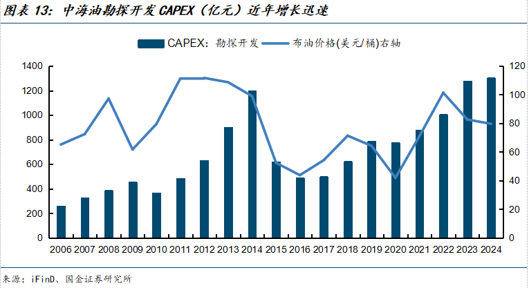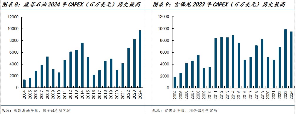 从“三桶油”的CAPEX支出数额和历史变化来看,近几年“三桶油”的CAPEX水平同样处于历史较高水平:中石油2023年勘探开发CAPEX支出2484亿元(折合353亿美元),为历史最高;中海油2024年勘探开发CAPEX支出1302亿元(折合181亿美元),为历史最高;中石化2022年勘探开发CAPEX支出833亿元(折合124亿美元),仅低于2013年的888亿元,为历史较高水平。