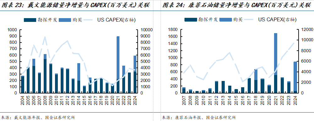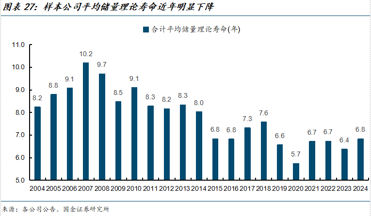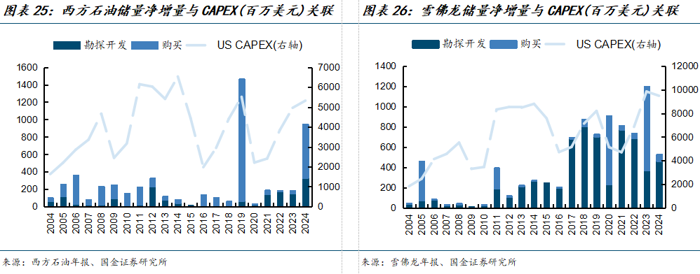 3、公司CAPEX水平对油气储量直接增加量的影响更为明显,但美国原油公司储量的理论寿命下降明显。