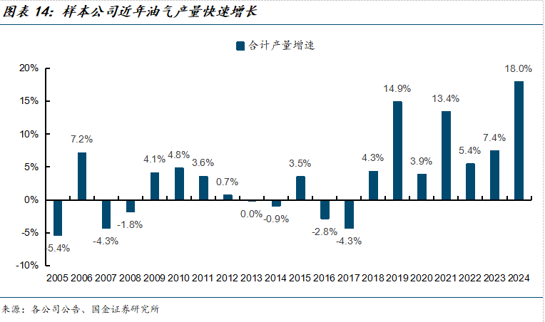 从七家样本公司合计的产量数据来看,近年来美国油气产量就一直处于增长趋势并且一直保持较快的增速,样本公司2024年的产量增速达到了历史最高的18%,油气当量产量达到900万桶/日。
