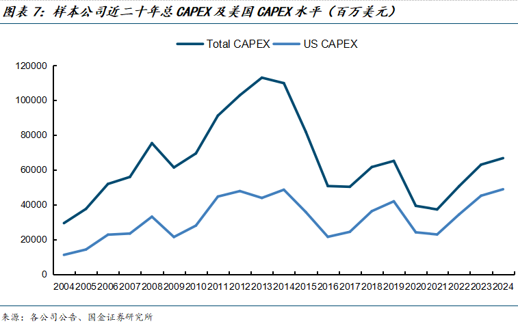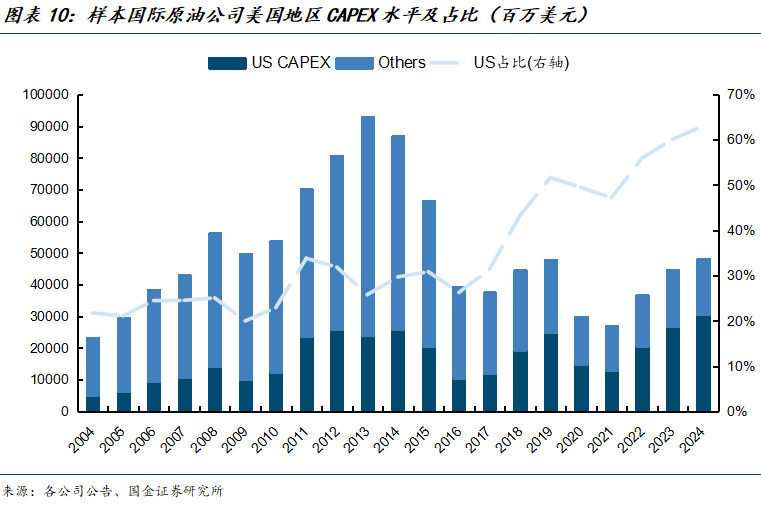 1、美国原油公司CAPEX跟随油价波动,近年总CAPEX有所下降但美国本土CAPEX水平及占比提升明显。