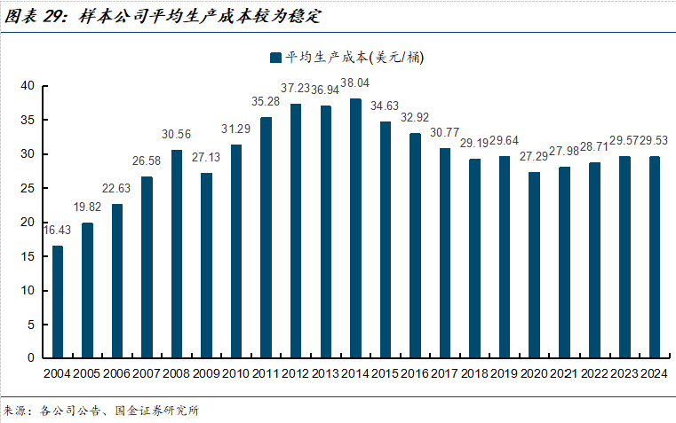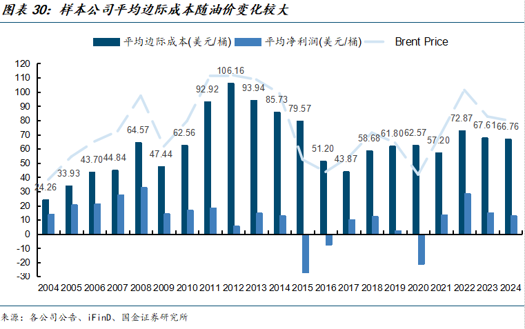 4、美国页岩油公司平均生产成本稳定在约30美元/桶,平均边际成本随油价变化较大。