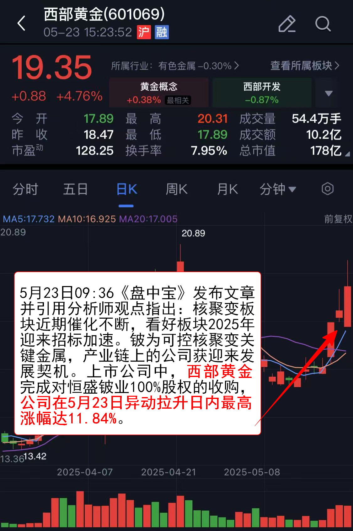 5月23日09:36《盘中宝》发布文章并引用分析师观点指出:核聚变板块近期催化不断,看好板块2025年迎来招标加速。铍为可控核聚变关键金属,产业链上的公司获迎来发展契机。上市公司中,西部黄金完成对恒盛铍业100%股权的收购,公司在5月23日异动拉升日内最高涨幅达11.84%。