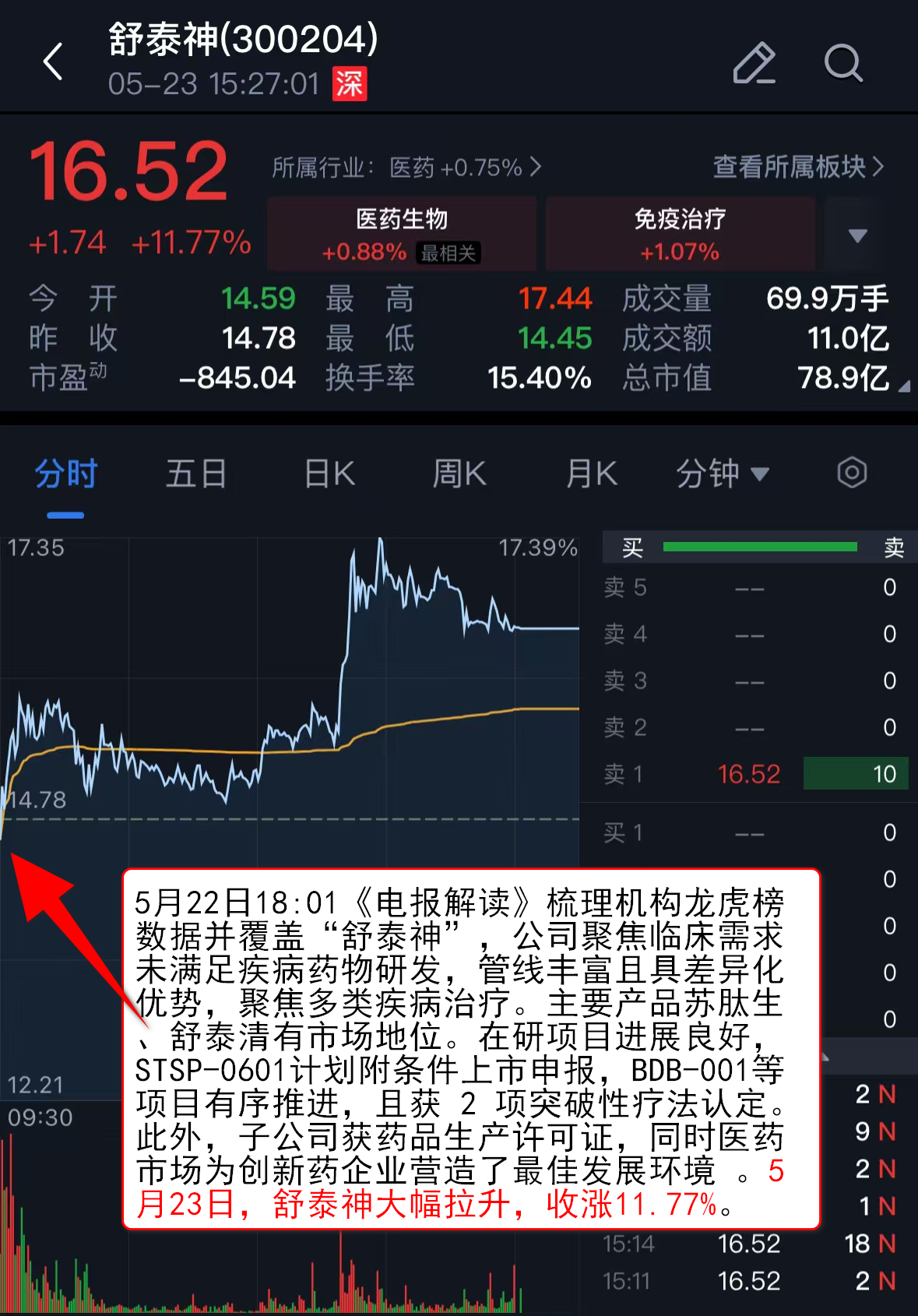 5月22日18:01《电报解读》梳理机构龙虎榜数据并覆盖“舒泰神”,公司聚焦临床需求未满足疾病药物研发,管线丰富且具差异化优势,聚焦多类疾病治疗。主要产品苏肽生、舒泰清有市场地位。在研项目进展良好,STSP-0601计划附条件上市申报,BDB-001等项目有序推进,且获 2 项突破性疗法认定。此外,子公司获药品生产许可证,同时医药市场为创新药企业营造了最佳发展环境 。5月23日,舒泰神大幅拉升,收涨11.77%。