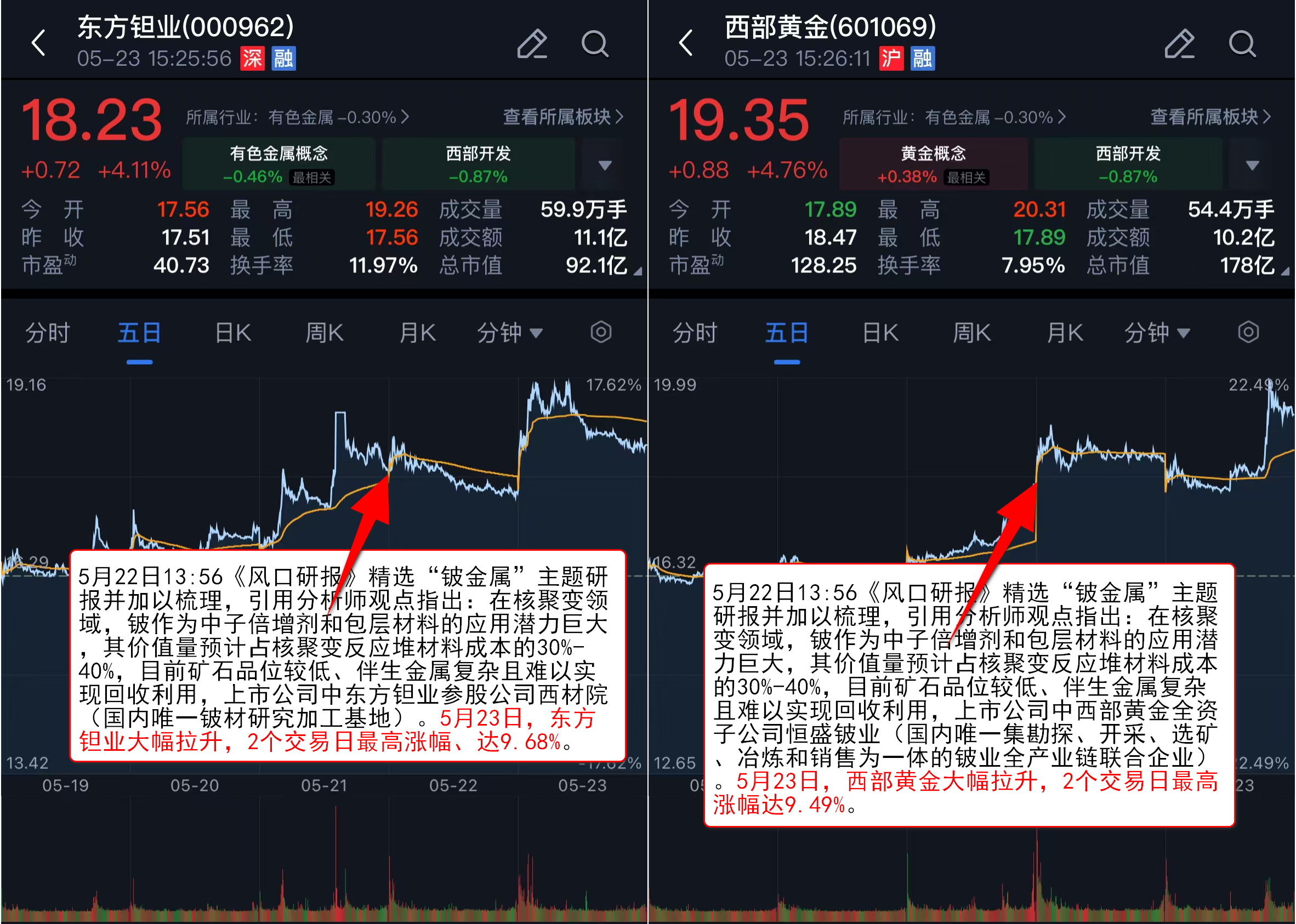 5月22日13:56《风口研报》精选“铍金属”主题研报并加以梳理,引用分析师观点指出:在核聚变领域,铍作为中子倍增剂和包层材料的应用潜力巨大,其价值量预计占核聚变反应堆材料成本的30%-40%,目前矿石品位较低、伴生金属复杂且难以实现回收利用,上市公司中东方钽业参股公司西材院(国内唯一铍材研究加工基地)、西部黄金全资子公司恒盛铍业(国内唯一集勘探、开采、选矿、冶炼和销售为一体的铍业全产业链联合企业)。5月23日,东方钽业、西部黄金双双大幅拉升,2个交易日最高涨幅分别达9.68%、9.49%。