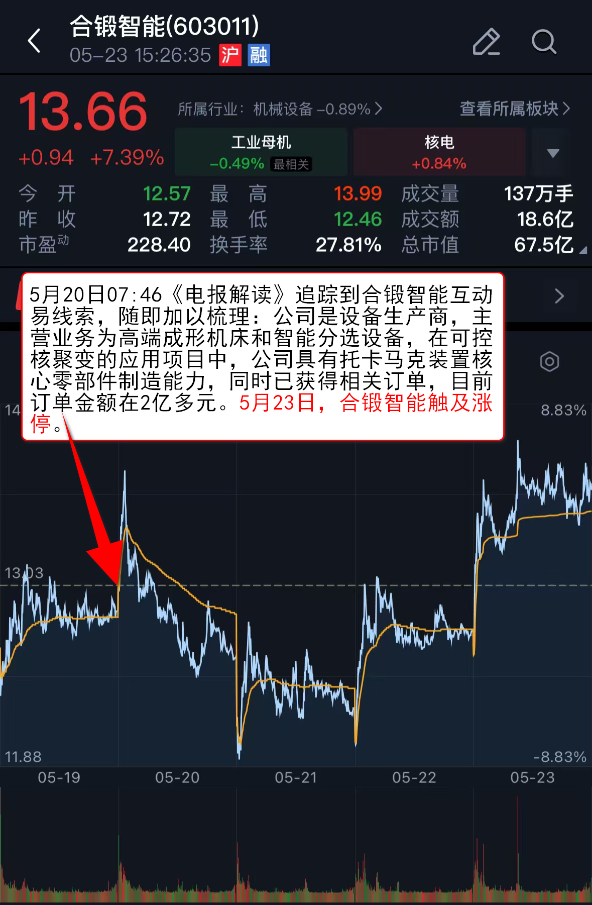 5月20日07:46《电报解读》追踪到合锻智能互动易线索,随即加以梳理:公司是设备生产商,主营业务为高端成形机床和智能分选设备,在可控核聚变的应用项目中,公司具有托卡马克装置核心零部件制造能力,同时已获得相关订单,目前订单金额在2亿多元。5月23日,合锻智能触及涨停。