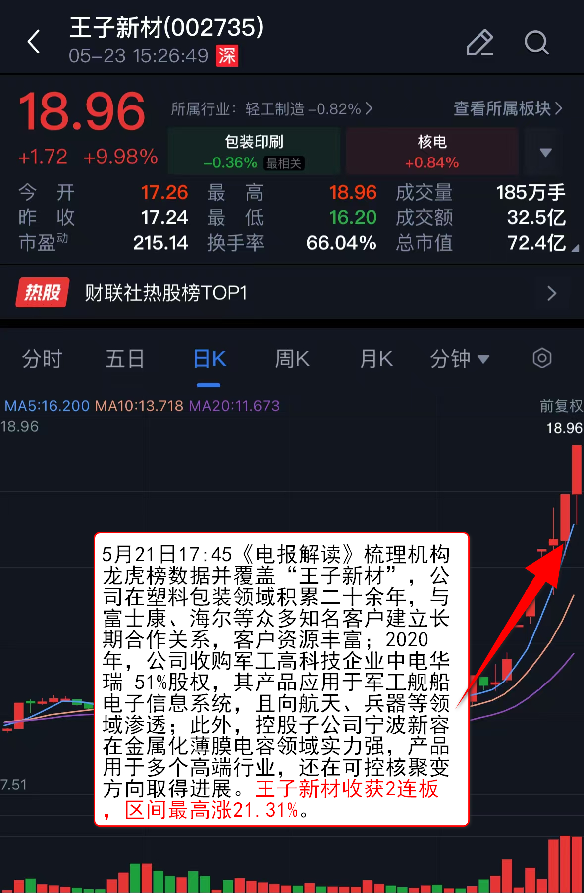 5月21日17:45《电报解读》梳理机构龙虎榜数据并覆盖“王子新材”,公司在塑料包装领域积累二十余年,与富士康、海尔等众多知名客户建立长期合作关系,客户资源丰富;2020 年,公司收购军工高科技企业中电华瑞 51%股权,其产品应用于军工舰船电子信息系统,且向航天、兵器等领域渗透;此外,控股子公司宁波新容在金属化薄膜电容领域实力强,产品用于多个高端行业,还在可控核聚变方向取得进展。王子新材收获2连板,区间最高涨21.31%。
