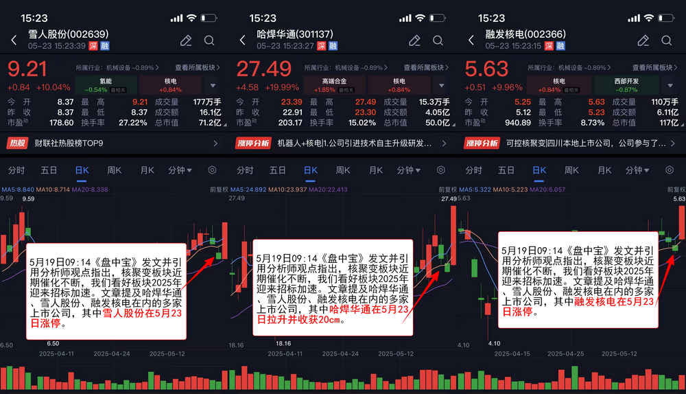 5月19日09:14《盘中宝》发文并引用分析师观点指出,核聚变板块近期催化不断,我们看好板块2025年迎来招标加速。文章提及哈焊华通、雪人股份、融发核电在内的多家上市公司,其中哈焊华通在5月23日拉升并收获20cm,融发核电和雪人股份在5月23日涨停。