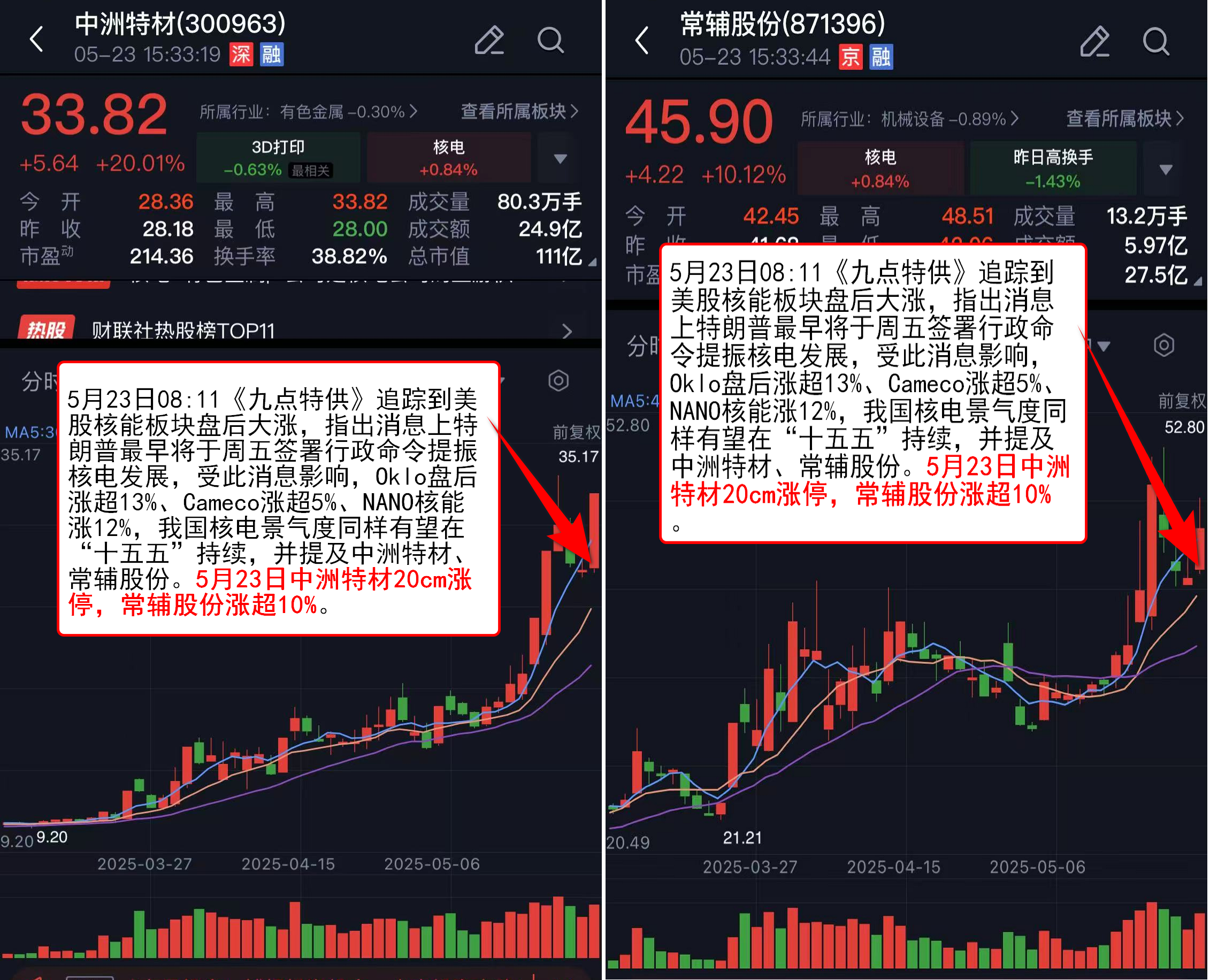 5月23日08:11《九点特供》追踪到美股核能板块盘后大涨,指出消息上特朗普最早将于周五签署行政命令提振核电发展,受此消息影响,Oklo盘后涨超13%、Cameco涨超5%、NANO核能涨12%,我国核电景气度同样有望在“十五五”持续,并提及中洲特材、常辅股份。5月23日中洲特材20cm涨停,常辅股份涨超10%。