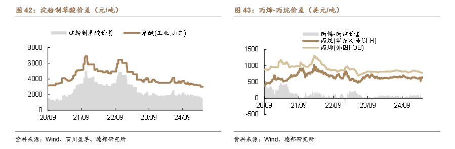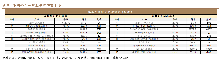 本周化工品价差涨幅前十名为:丙烯-丙烷价差(+24美元/吨)、MTBE气分醚化法价差(+550元/吨)、丙烯酸-丙烯价差(+5020元/吨)、苯酚+丙酮-原料价格(+2499元/吨)、丙烯酸丁酯-丙烯酸-正丁醇价差(+59元/吨)、三聚磷酸钠-黄磷-纯碱价差(+250元/吨)、乙二醇-乙烯价差(+244元/吨)、纯苯-石脑油价差(+676元/吨)、顺酐-碳四原料气价差(+468元/吨)、碳酸二甲酯/丙二醇联产价差(+1509元/吨)。