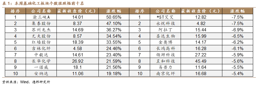 在基础化工板块424只股票中,本周303只股票上涨,110只股票下跌,11只股票持平。本周个股涨幅前十名分别为:渝三峡A(+50.6%)、集泰股份(+47.1%)、苏州龙杰(+36.3%)、尤夫股份(+34.5%)、红墙股份(+33.6%)、吉林化纤(+24.5%)、中毅达(+23.4%)、长华化学(+21.6%)、一诺威(+21.6%)、安纳达(+19.2%)。本周个股跌幅前十名分别为:*ST艾艾(-7.5%)、永悦科技(-7.5%)、阿拉丁(-6.9%)、圣达生物(-6.5%)、金奥博(-6.2%)、长鸿高科(-6.1%)、领湃科技(-5.9%)、呈和科技(-5.6%)、易普力(-5.5%)、南京化纤(-5.4%)。