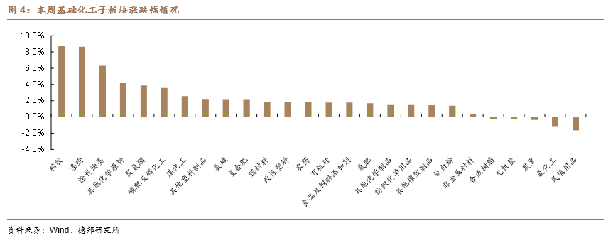 细分板块看,在基础化工26个子板块中,21个子板块上涨,5个子板块下跌。本周子板块涨跌幅前五名分别为:粘胶(+8.7%)、涤纶(+8.6%)、涂料油墨(+6.3%)、其他化学原料(+4.2%)、聚氨酯(+3.9%);本周子板块涨跌幅后五名分别为:民爆用品(-1.7%)、氟化工(-1.2%)、炭黑(-0.4%)、无机盐(-0.3%)、合成树脂(-0.2%)。