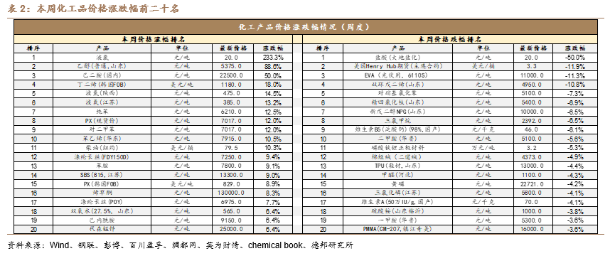 本周化工品价格涨幅前十名为:液氯(+233.3%)、乙醇(普通,山东)(+88.6%)、己二胺(国内)(+50%)、丁二烯(韩国FOB)(+18%)、液氮(陕西)(+14.5%)、液氧(江苏)(+13.2%)、纯苯(+12.5%)、PX(现货价)(+12%)、对二甲苯(+12%)、苯乙烯(华东)(+10.5%)。